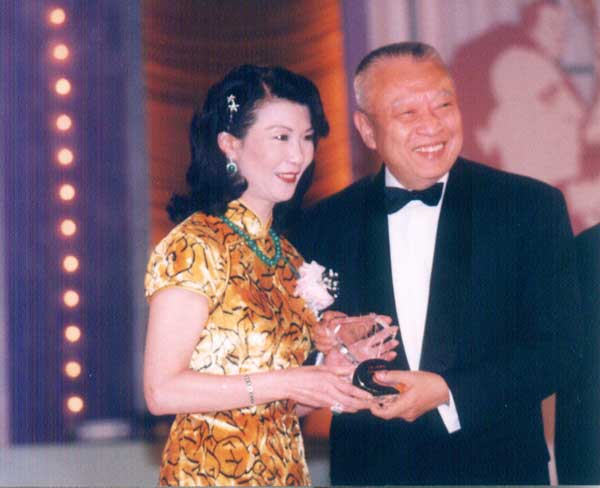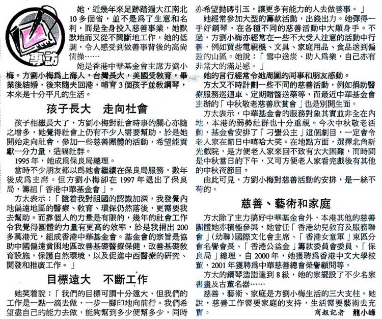 2002年7月23日香港商報報導 方劉小梅在慈善活動中致贈紀念品予特首董建華